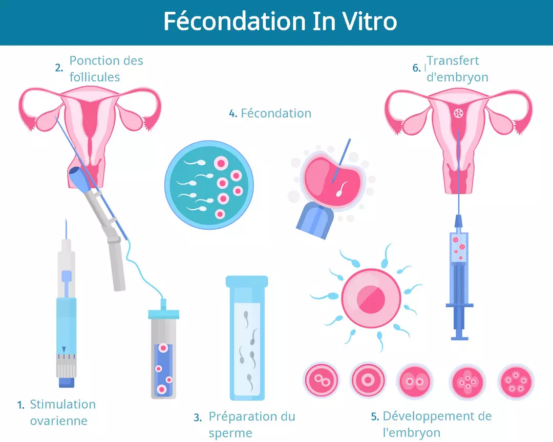 5- Le Transfert d 'embryons : cette étape est programmée 3 à 6 jours plus tard après la fécondation. Un à deux embryons sont transférés dans l 'utérus à l 'aide d 'un fin cathéter. La patiente peut reprendre une activité normale immédiatement après.